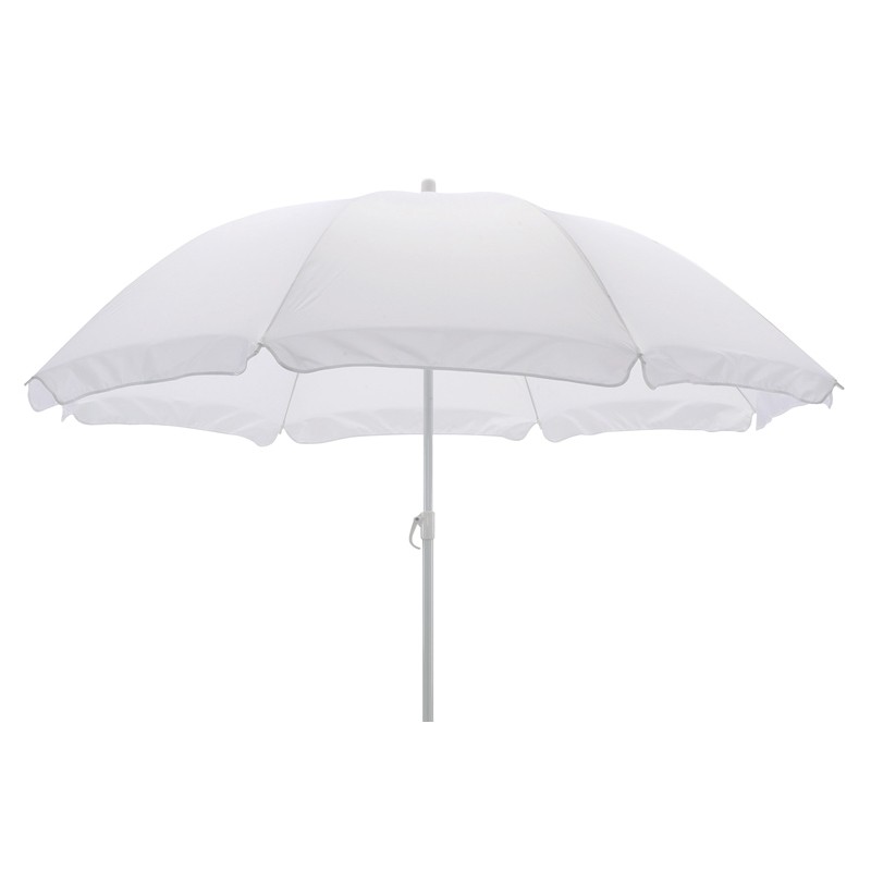 Quitasol de 8 cascos en tela Nylon 190T. Incluye 2 varas metálicas blancas desmontables, la inferior de 101 cm y la superior de 95 cm. Presentación en funda de PVC transparente con broche.