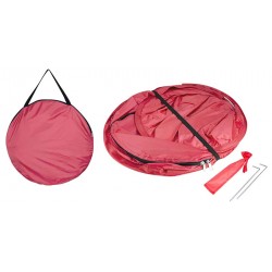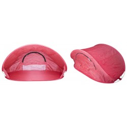 Mini Carpa plegable de Playa. Material 100% poliéster, con bolsillos interiores, ventana de ventilación y funda para guardar. Contiene varas de 3mm de espesor y un juego de 2 estacas para la arena en bolsita de poliéster. Muy práctica para proteger cabeza y niños pequeños de la exposición prolongada al sol. Fácil de armar y desarmar.