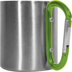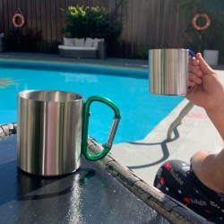 Ø 7 x 7,8 cm. Acero inoxidable. Capacidad 220 ml. Vaso de Acero con Mosquetón. Exterior: Acero inoxidable 201 / Interior: Acero inoxidable 304. Asa carabinero de aluminio con diferentes opciones de color. Mantiene las bebidas frías y calientes por más tiempo. Te acompaña donde vayas, ideal para camping o cualquier actividad al aire libre. Se entrega en Polybag (bolsa de plástico)
