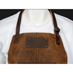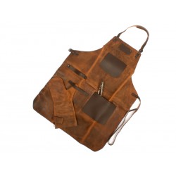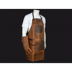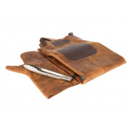 Un regalo fuera de serie. Deluxe set de Asador, contiene Pechera de Asador BBQ en cuero curtido, envejecido y suavizado 100% genuino color café cognac, con cintas y porta-accesorios de Cuero 100% genuino color café oscuro. Remaches de acero envejecido y 2 bolsillos delanteros de 22 x 18 cm. y 18 x 14 cm. Rectángulo para logo de 10 x 5 cm. Contiene además largo mitón de Asador BBQ en cuero curtido, envejecido y suavisado 100% genuino color café cognac y tenazas de Acero inoxidable. Presentación en elegante caja de regalo de cartón negro con ventana de mica transparente y gráfica a todo color con descripción de los elementos del set.