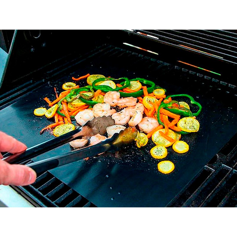 Set de 2 alfombrillas de teflón y fibra de vidrio, para cocinar mariscos, carnes, pescados o verduras sobre la parrilla . Resiste temperaturas hasta 260°C. Apilable, liviana, lavable y reutilizable.