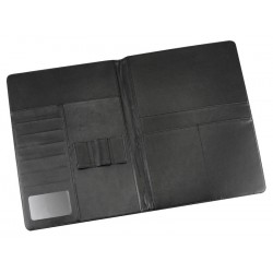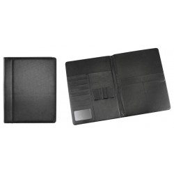 Carpeta Simil Cuero Negro. En el interior incluye Bolsillos para documentos tamaño A4, Compartimentos para Tarjetas Y Porta-Lápices.