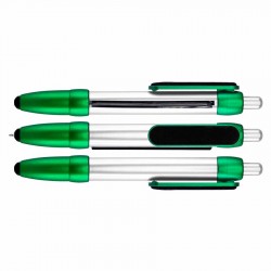 Bolígrafo plástico modelo «Flag», con cuerpo plateado y terminales de color metalizado. Incluye bandera retráctil de tela (para impresión), puntero «Touch-Screen» y clip gamuzado negro para limpiar pantalla táctil. Escritura azul.