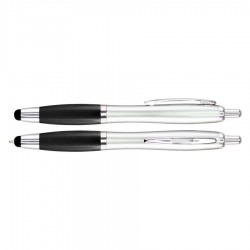 Bolígrafo plateado «New Satin Touch-Screen» con goma negra para pantalla táctil. Escritura azul.