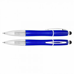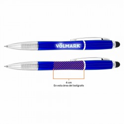 Bolígrafo plástico con puntero screen-touch al tono, modelo «NEON». Incluye luz LED al interior, para retroiluminar logo grabado sobre el cuerpo del bolígrafo. Escritura azul.