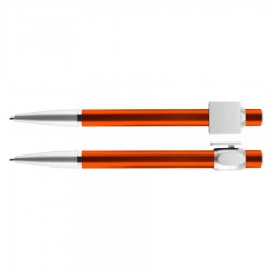 Bolígrafo «Badge» con cuerpo de color metalizado y clip cuadrado plateado, ideal para imprimir isotipos. Escritura azul.