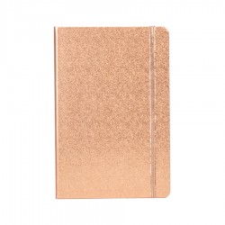 Cuaderno tamaño A5, con cubierta de cartón piedra forrada en PU color cobre de 1.5mm de espesor, interior 80 hojas amarillas lineadas de 80 gsm. Incluye banda elástica y huincha separador de hojas al tono. Presentación individual en bolsa de polipropileno translúcido.