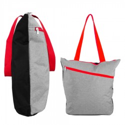 Bolso de compra modelo «Oxford», en tela Poliéster 300D/PVC gris jaspeado, mangos y cierres de color. Incluye bolsillo delantero. Reverso negro en tela poliéster 600D.