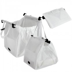 Bolsa reutilizable de tela no tejida (TNT) super-resistente de 120g/m2. Cuenta con 2 asas de 40cm. c/u aprox. Contiene 2 soportes plásticos rígidos negros, para enganchar en las paredes laterales de los carros de supermercados tradicionales. Sistema de cierre pestaña con velcro, bolsillo lateral y frontales superiores elasticados para maximizar la superficie de apertura sobre el carro. 100% plegable para fácil transporte y guardado.