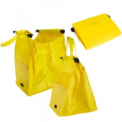 Bolsa reutilizable de tela no tejida (TNT) super-resistente de 120g/m2. Cuenta con 2 asas de 40cm. c/u aprox. Contiene 2 soportes plásticos rígidos negros, para enganchar en las paredes laterales de los carros de supermercados tradicionales. Sistema de cierre pestaña con velcro, bolsillo lateral y frontales superiores elasticados para maximizar la superficie de apertura sobre el carro. 100% plegable para fácil transporte y guardado.