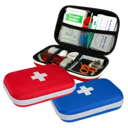 Kit de Primeros Auxilios en Estuche rígido de tela. Contiene 49 accesorios: 1 cabestrillo triangular, 1 linterna dínamo, 1 pito, 1 cinta adhesiva, 1 mascarilla, 4 toallitas húmedas antisépticas, 5 sobres con gaza estéril, 10 alfileres de gancho, 1 manta térmica plateada, 1 pinza, 1 multi-herramienta tarjeta metálica con funda, 1 banda PBT, 1 tijera, 10 toallitas húmedas con alcohol, 10 parche curitas.