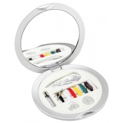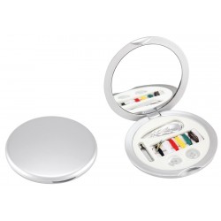 Set de Costura plateado redondo con espejo. Presentación en caja plateada de cartón.