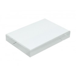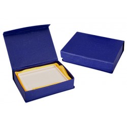 Trofeo rectangular de Cristal sólido para Sublimación. Presentación en caja de cartón azul con cuna amarilla.