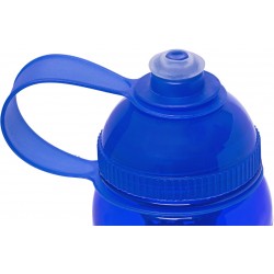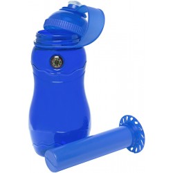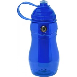 Ø 6,5 x 19,5 cm. Capacidad: 500 ml. Plástico. Botella con cilindro extraíble, sirve para enfriar las bebidas. Tapa rosca y boquilla deportiva de goma. Viene con brújula de decoración. No utilizar con bebidas gaseosas