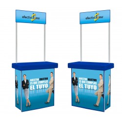 El stand portátil es de cubiertas de Plástico inyectado de alta resistencia y calidad, posee pilares metálicos de color blanco de ensambles, destaca por su eficiencia en el punto de venta y posee dos áreas gráficas para el desarrollo de imagen. Su peso estimado es de 7 kg y es desarmable para poder ser guardado en la bolsa de genero la cual está incluida sin costo en el valor del producto.(Sujeto a disponibilidad de stock).